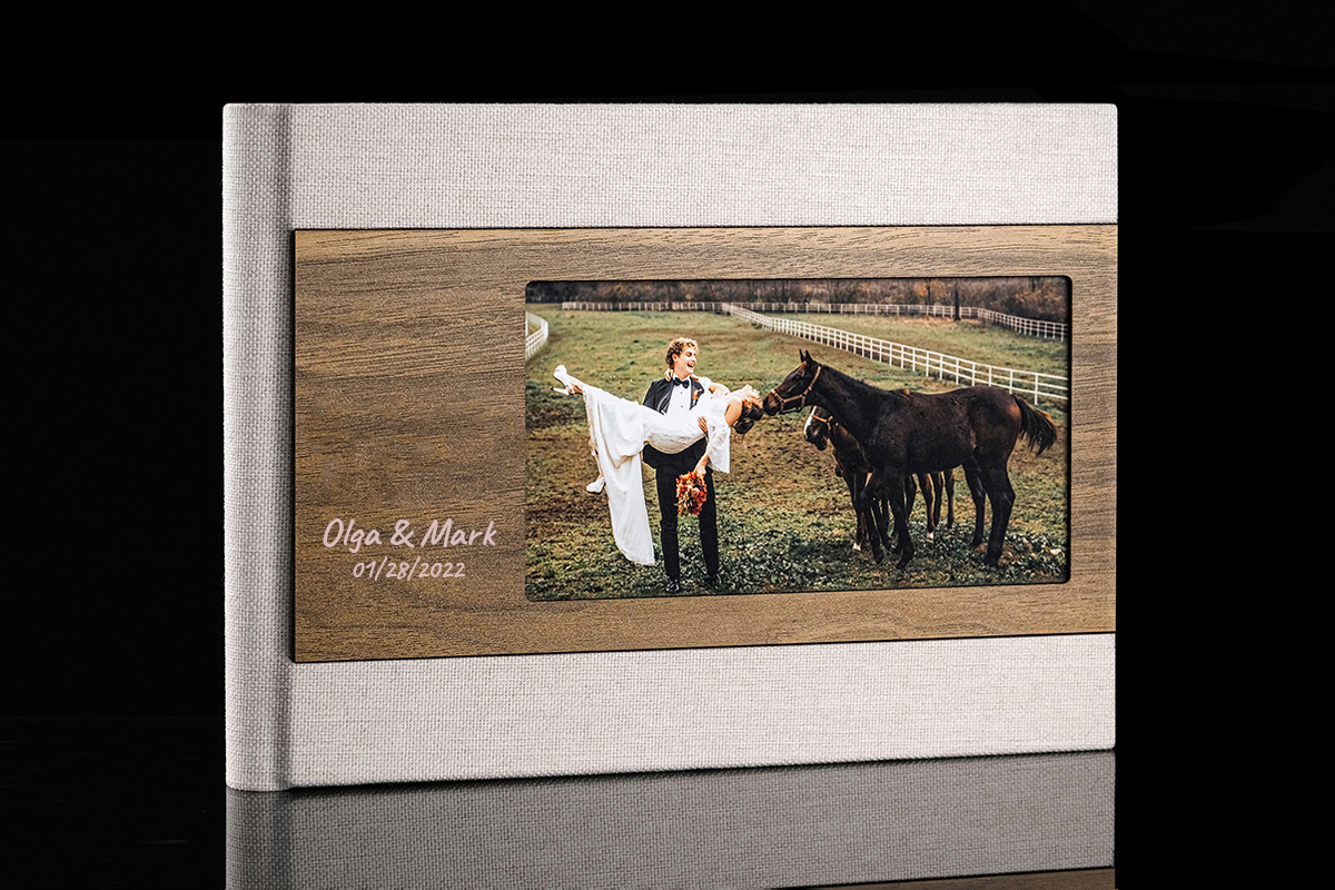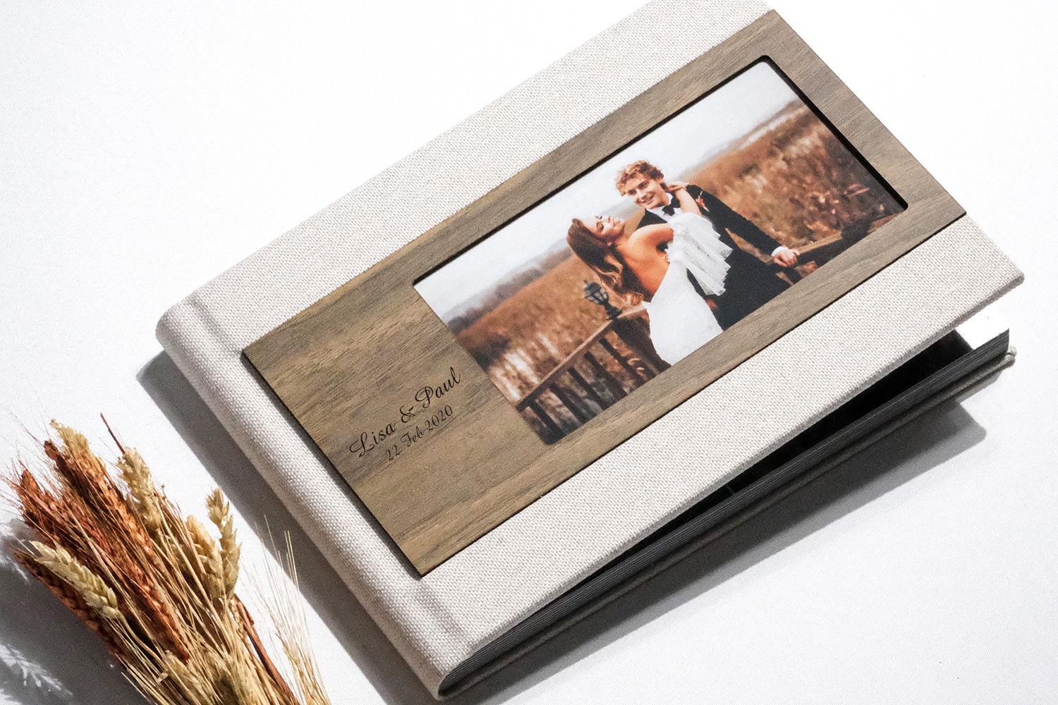 Linen and wooden front cover with smaller photo of your request,